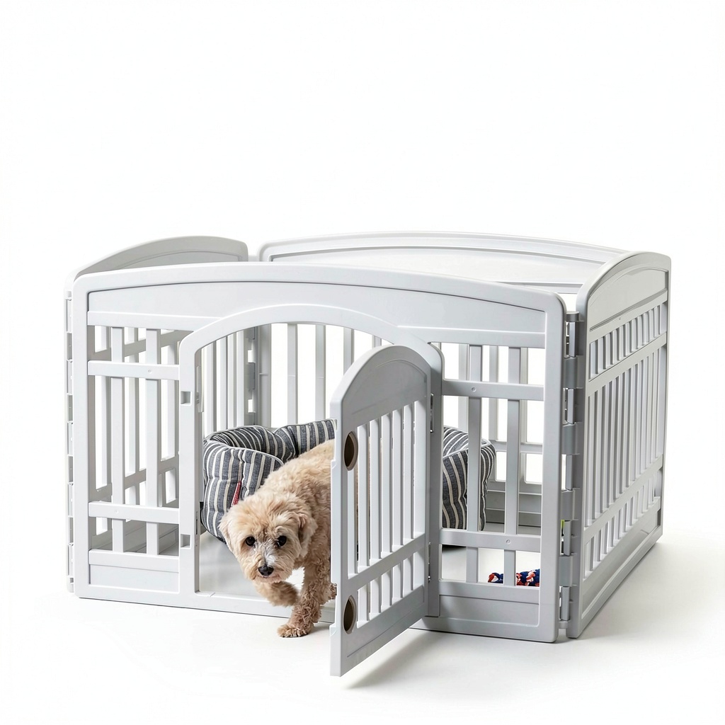The IRIS USA dog playpen provides a safe and spacious 61×61 inch area for small to medium breeds, made from durable, easy-to-clean plastic. It features a convenient door panel and simple snap-together assembly, perfect for both indoor and outdoor use. This playpen is expandable with additional panels, growing with your pet’s needs.